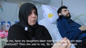 شبكة فلسطين الإخبارية قصة مواطنة من غزة سافرت الى الضفة لعلاج احد أبنائها قبل الحرب وخلال الحرب فقدت كافة ابناءها في قطاع غزة وعائلتها وتم هدم منزلها ولم يعد هناك أي شيء لها وهي تتحدث عن معاناة الغزيين وهي تقول انها لا تريد ان تعود لغزة الان –