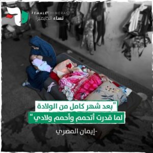 فيميل شايميرس إيمان المصري، أم لثلاثة أطفال، واجهت النزوح من منزلها في بيت حانون بسبب القصف وهي حامل في شهرها السادس. بحثاً عن الأمان، تم إجلاؤها إلى دير البلح، حيث نامت هي وعائلتها على الأرض في ساحة المدرسة. وفي ظل هذه الظروف الصعبة، اضطرت بشكل غير متوقع إلى الخضوع لعملية ولادة قيصرية دون الاستعداد المناسب. وبعد الولادة، عادت لتقيم في فصل دراسي يفتقر إلى الإمدادات الأساسية مثل الفوط الصحية لها ولأطفالها. وهذا يسلط الضوء على الواقع القاسي الذي تواجهه الأمهات النازحات في مناطق النزاع، اللاتي يكافحن من أجل ضمان رفاههن ورفاه أطفالهن وسط الشدائد.