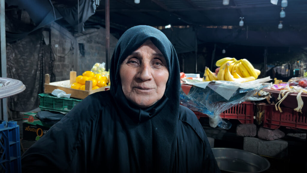 ام حيدر سيدة سبعينية قضت اكثر من نصف قرن من عمرها في بيع الفواكه وهي تهتم بترتيب بضاعتها لتجذب الزبائن حتى أصبحت من اقدم واشهر بائعات الفاكهة في مدينة الصدر.