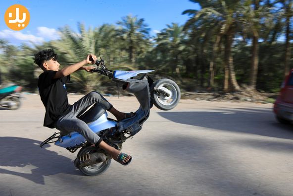حركات بهلوانية “خطرة” بالدراجة.. ألعاب نارية وأسلحة بلاستيكية، وأطفال يلعبون على أرجوحة مصنوعة من جذع النخل. أجواء العيد في منطقة قريبة من مدينة الحلة بمحافظة بابل