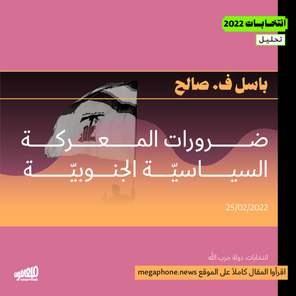 لم تقف هذه التوجهات السابقة على مستوى الجنوب بالتحديد، إلا أن للجنوب الحيّز الأساس، والثقل الأكبر، فيها. ففي الجنوب، المواجهة هي مواجهة مفتوحة مع رأس حربة النظام الذي يمثله الحزب، ولهذا السبب، لن يتوانى الحزب عن استخدام كل ما هو ضروري لإدامة سيطرته. وذلك ليس انطلاقًا من معارك خيالية يخوضها بعناوين حربية مباشرة كعنوان «حرب تموز»، ولا لناحية التشكيك بوطنية كل من يواجهه سياسيًا أو انتخابيًا وصولاً إلى اتهامه بالعمالة ووضعه في فلك العدو والسفارات.