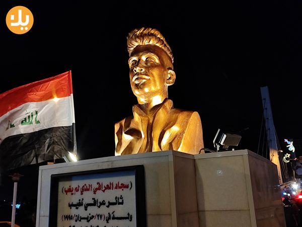 مواطنون يزيحون الستار عن تمثال للناشط المغيّب “سجاد العراقي” في فلكة جسر الحضارات بمدينة الناصرية. سجاد اختطف في أيلول ٢٠٢٠ من قبل مسلـ.ـحين مجهولين، ولا يزال مصيره مجهولاً حتّى الآن.