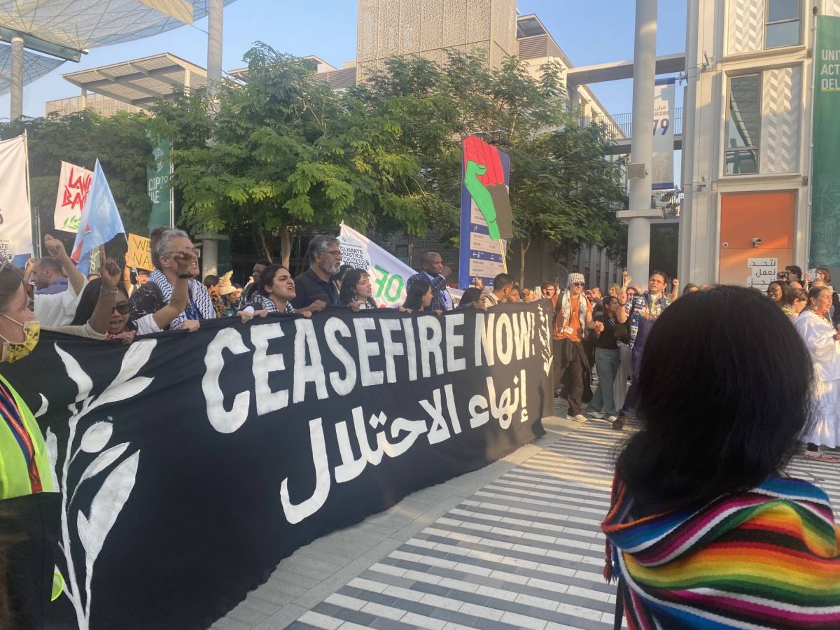 هدنة الآن!” في دبي، ترتدي الجماهير الملونة الكوفية.