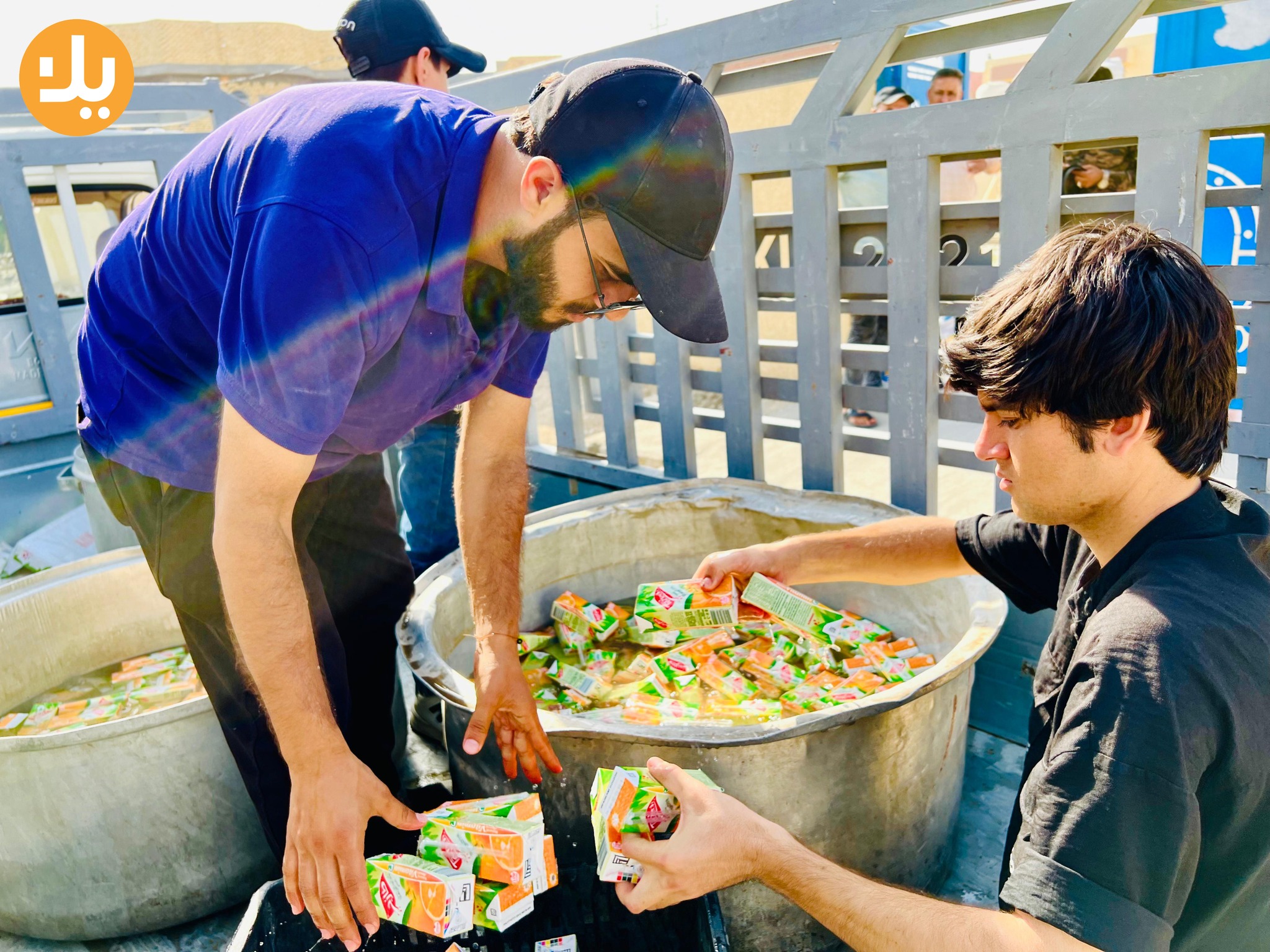 مجموعة من شباب مدينة القاسم جنوب محافظة بابل يشترون العصائر والماء البارد والثلج ويوزعونها على المراكز الامتحانية لطلاب السادس الإعدادي.