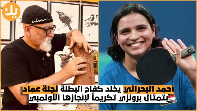 تستاهل البطلة.. فنان عراقي عالمي يهدي المتوجة بالذهب نجلة عماد تمثالاً من البرونز