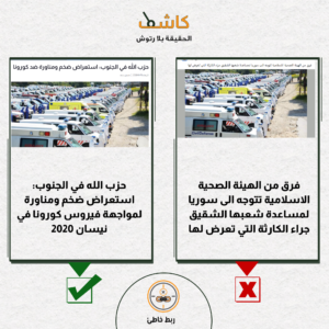 Arij Pictures and video spread of Hezbollah displaying their medical equipment in a maneuver to confront the Corona virus in 2020, with the claim that it is of Hezbollah teams heading to Syria to help them due to the earthquake.
