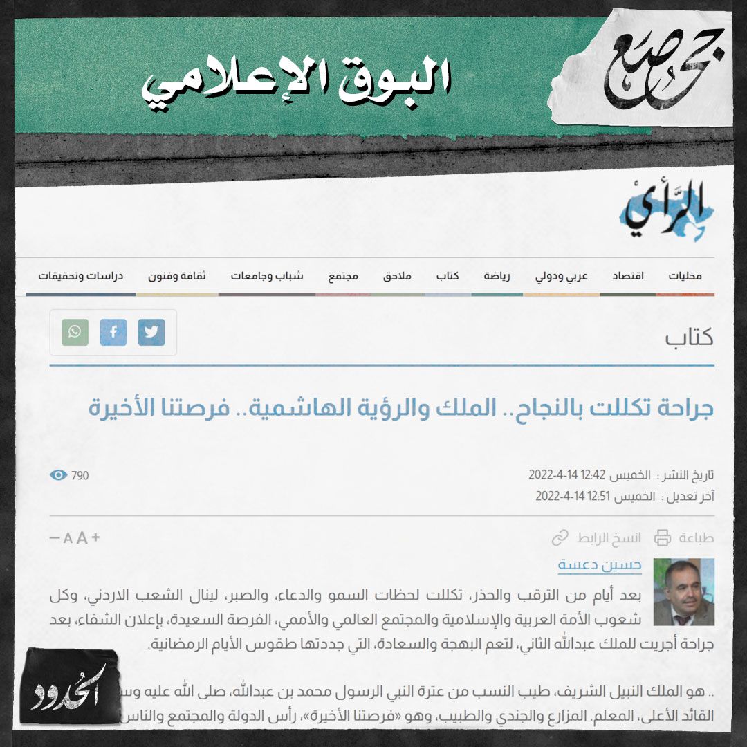 الصحافة الأردنية تضيف نجاح عملية الملك في ألمانيا إلى سلسلة إنجازاته صوت لهذا الخبر عن فئة #البوق_الإعلامي: https://alhudood.net/aaaj#voting Posted by AlHudood شبكة الحدود on Sunday, April 17, 2022