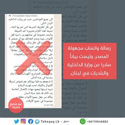 وصلتنا رسالة متداولة على واتساب على أنها بيان صادر عن “وزارة الداخلية”، وبعد العودة إلى المصادر الرسمية لم نجد أن وزارة…