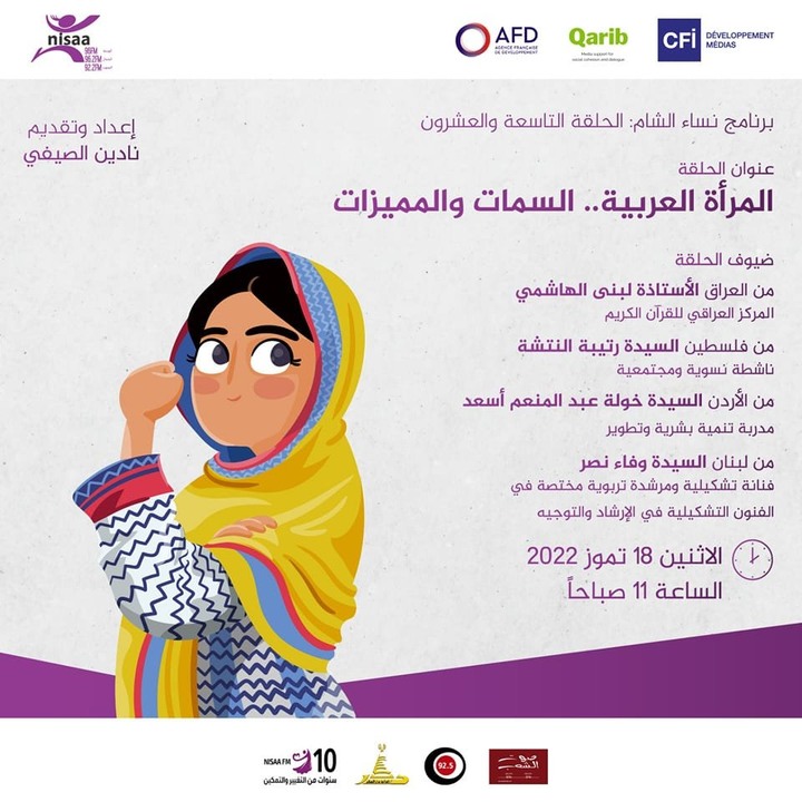 نساء الشام الحلقة 29 – المرأة العربية.. السمات والمميزات الحلقة التاسعة والعشرون من #نساء_الشام المرأة العربية.. السمات والمميزات. #Qaribmedia Posted by Radio Nisaa on Monday, July 18, 2022