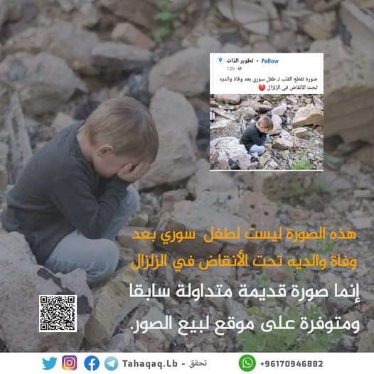 هذه الصورة لطفل يقف فوق ركام من الأحجار متداولة سابقا ومتوفرة على موقع لبيع الصور، وليست لطفل سوري بعد وفاة والديه تحت… Posted by تحقَّق 360 on Tuesday, February 7, 2023