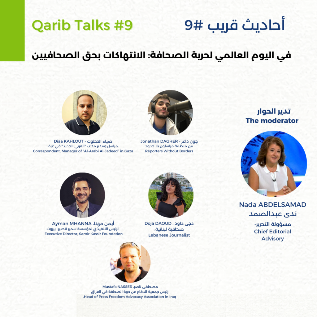 وبالمناسبة نظم برنامج قريب ندوة ضمن أحاديث قريب مع خبراء وأعضاء في منظمات دولية لنقاش كل ما يتصل بالانتهاكات التي يتعرض لها الصحافيون. وقد شارك فيها دجى داوود صحافية ومتابعة لقضايا حقوق الصحافيين، جونثان داغر مسؤول الشرق الاسط في “مراسلون بلا حدود” ، أيمن مهنا المدير التنفيذي لمؤسسة سمير قصير. كما شارك في الندوة مصطفى ناصر رئيس جمعية الدفاع عن حرية الصحافة في العراق بالإضافة الى ضياء الكحلوت وهو صحفي من غزة اعتقلته القوات الإسرائيلية وتعرض للتعذيب اثناء الاقتحامات في غزة وهو اليوم خارج القطاع.