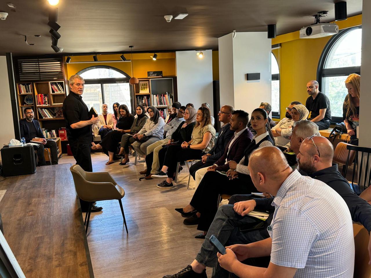 Qarib, represented by Program Director Henrik Ahrens, organized a full-day in-person meeting at the Institut Français in Ramallah. The event brought together representatives from more than 30 Palestinian media outlets from Gaza, the West Bank, and East Jerusalem.