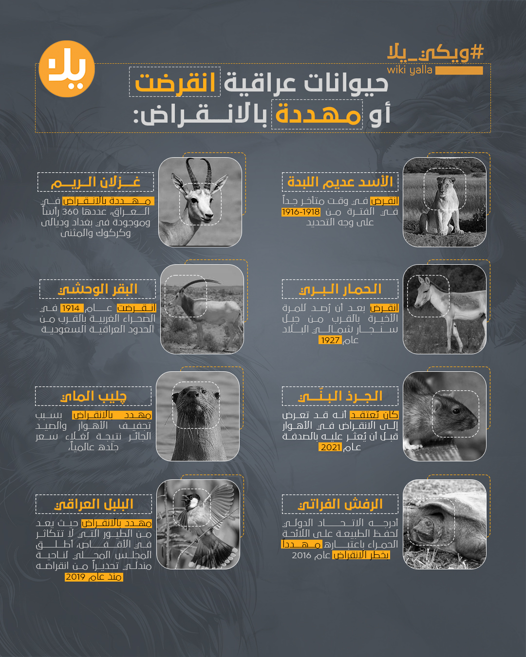 # Wiki Yalla Iraq has lost several animal species, including the “Lions of Mesopotamia,” which went extinct over the past 100 years, while others are now endangered due to poaching and habitat loss.